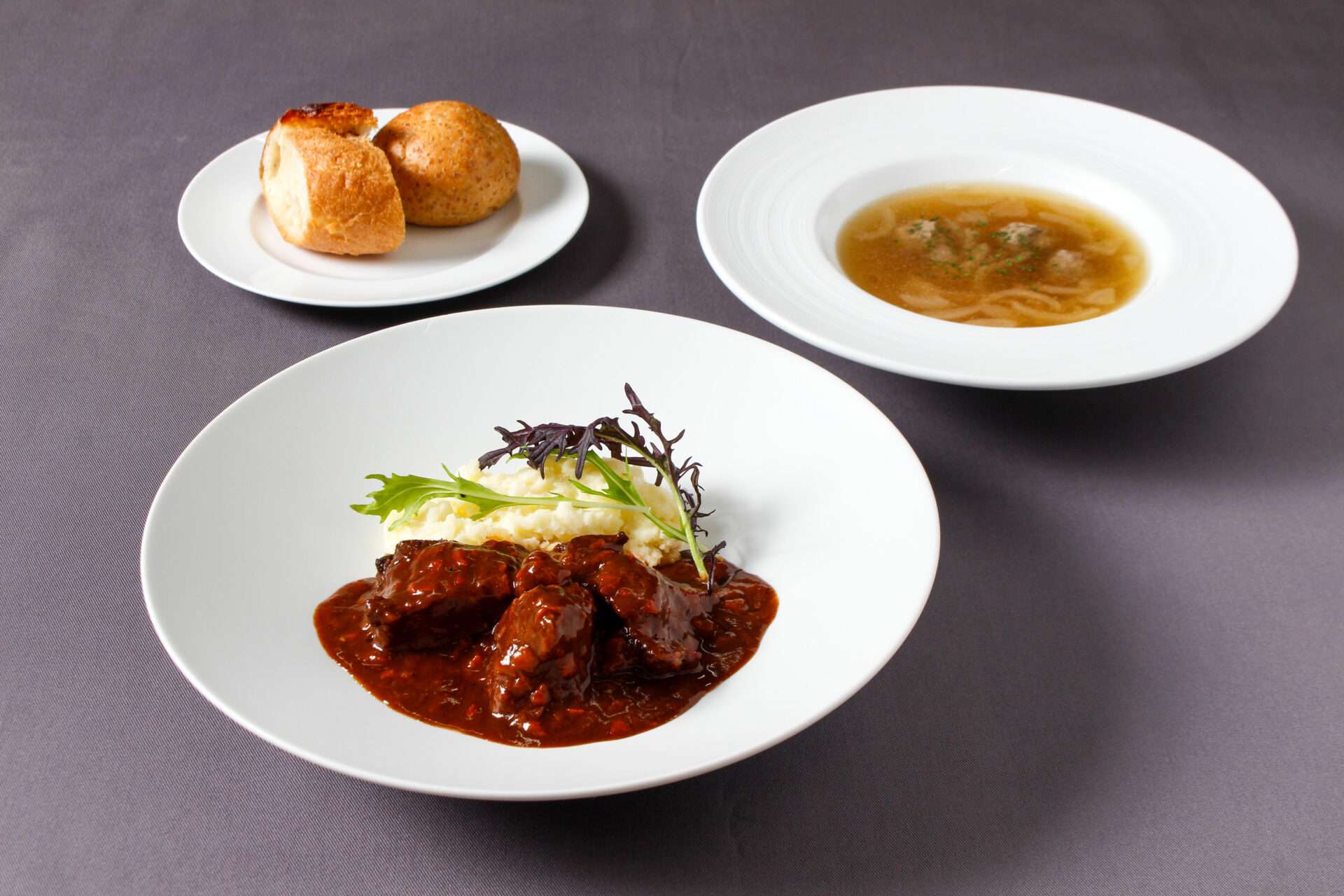 オーストリアの郷土料理「ターフェルシュピッツ」を、野性味あふれる鹿肉でアレンジ。じっくりと香味野菜とともに煮込むことで、鹿肉特有の深い味わいを引き出しました。ほろりとほどける柔らかさと、上品な旨味をお楽しみいただけます。