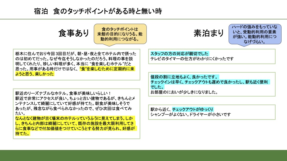 当ホテルでは、素泊まりでご利用されるお客様に比べ、食のタッチポイントがあるお客様満足度が高い傾向がある。