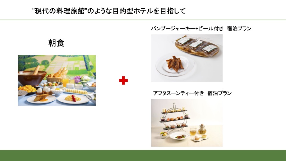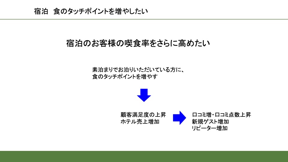 食のタッチポイントを増やし、宿泊のお客様の喫食率をさらに高めたいと考えています。