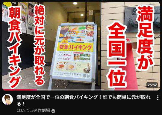 YouTubeチャンネル「はいじい迷作劇場」様にて、朝食バイキングをご紹介いただきました(2025年10月29日)。